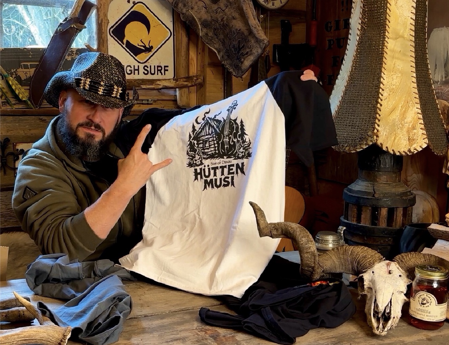 Im Winter ziehe ich mich in eine eingeschneite Alpenhütte zurück und starte mit befreundeten Musiker ein rohes und ungebremstes Musikprojekt. Gemeinsam und fernab vom Studioalltag entsteht ein experimentaler, schwerer bayerischer Sound. Wir arbeiten mit allem, was uns zur Verfügung steht. Mit neuester Technik und ältesten Instrumente, ramponierten Amps und polierten Laptops machen wir uns die mystische Energie der Berge zunutze.